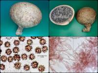 Péridium dépourvu de boucles. Spores globuleuses, de taille variable, 8-15 µm, ornées d'épines robustes, pyramidales, hautes de 1,3-2 µm, parfois groupées, brun rougeâtre.
