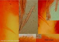 Suboblongues à largement ellipsoïdes vues de face, aplaties et typiquement subréniformes vues de profil, lisses, à paroi mince, hyalines, inactives dans le Melzer, 5-6 (-7) x 3-3,5 µm. Basides cylindriques-clavées, 4 stérigmates, 23 x 4,5-5 µm. Cystides abondantes dans la trame, aciculées à étroitement coniques, à paroi épaisse, jusqu'à 70 µm de longueur, 8-10 µm de diamètre, incrustées sur une longueur apicale de 60 µm, atténuées jusqu'à 4-5 µm à la base de l'incrustation, émergentes jusqu'à 40 µm. Dimitique : ( 1 ) - Hyphes génératrices bouclées, à paroi mince, hyalines, 2-3 µm de diamètre. ( 2 ) - Hyphes squelettiques, non septées à paroi épaissie, rarement ramifiées, 2,5-4-(7)µm de diamètre.