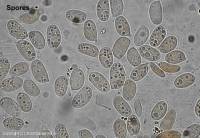 Cylindriques-elliptiques, 7-10(-12) x 3,5-5 µm, lisses, hyalines, guttulées ou avec quelques granulations, déprimées latéralement, blanches en masse. Basides étroitement clavées, subumiformes, 25-35 x 7-10 µm tétrasporiques, bouclées, avec quelquefois des cloisons secondaires. Lamprocystides nombreuses, fusiformes, à parois épaisses, incrustées, 80-100 x 10-17 µm. Monomitique. Hyphes à parois minces ou épaissies, larges de 2,5-5 µm, cloisonnées, bouclées.
