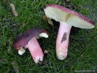 Russula amoenipes possède chapeau vineux roussâtre et stipe rose carmin puis miel en bas.