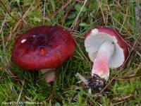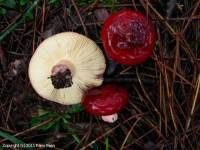 Russula suberythropus (nom. inval.) pousse sous Picea, possède un chapeau rouge vif au centre souvent très sombre.
