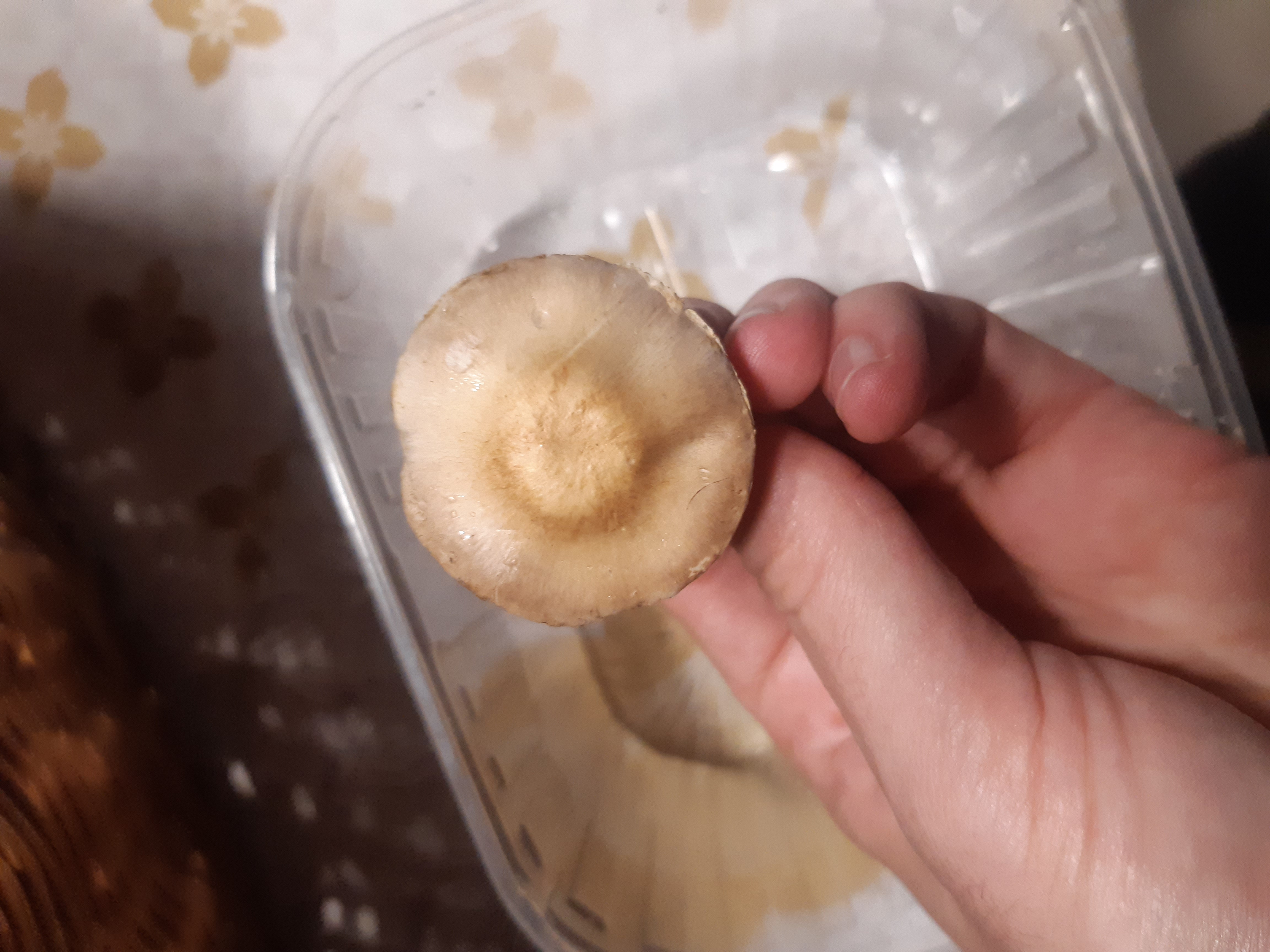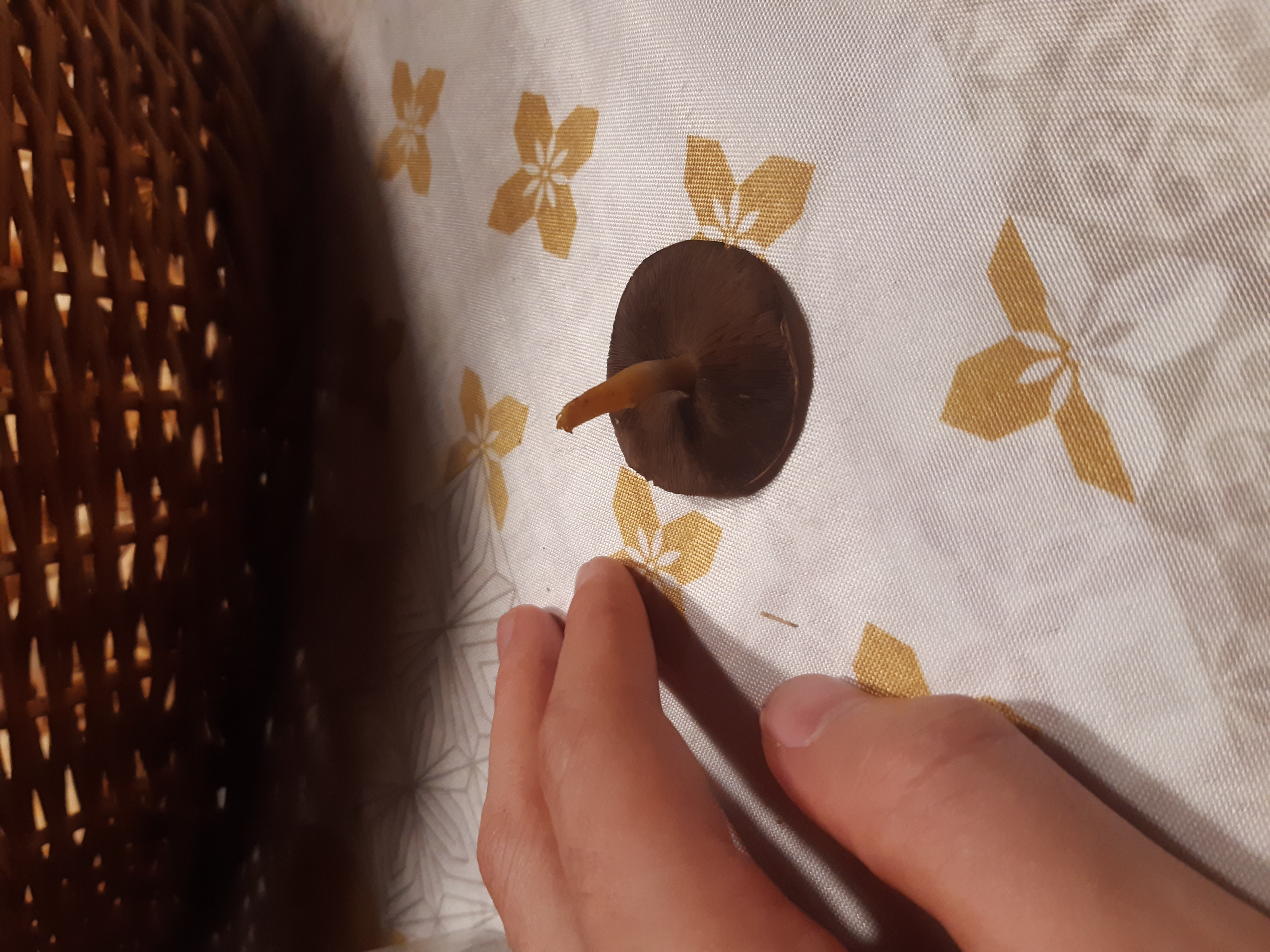Je viens de ramasser quelques mousserons, et au milieu des mousserons j'ai trouvé deux champignons qui y ressemblaient comme deux gouttes d’eau vu de dessus, même taille, chapeau brun/beige avec un bosse au centre, pied filandreux et assez fin, mais qui présentent vu de dessous des lamelles très sombres (presque noires, légèrement violacées) et très serrées (et la sporée est également sombre). Ce champignon présente également une forte odeur d'amande amère. Je n’ai pas vu d’anneau sur le pied que j'ai coupé, et, comme le mousseron, les lamelles ne montent pas sur le pied.