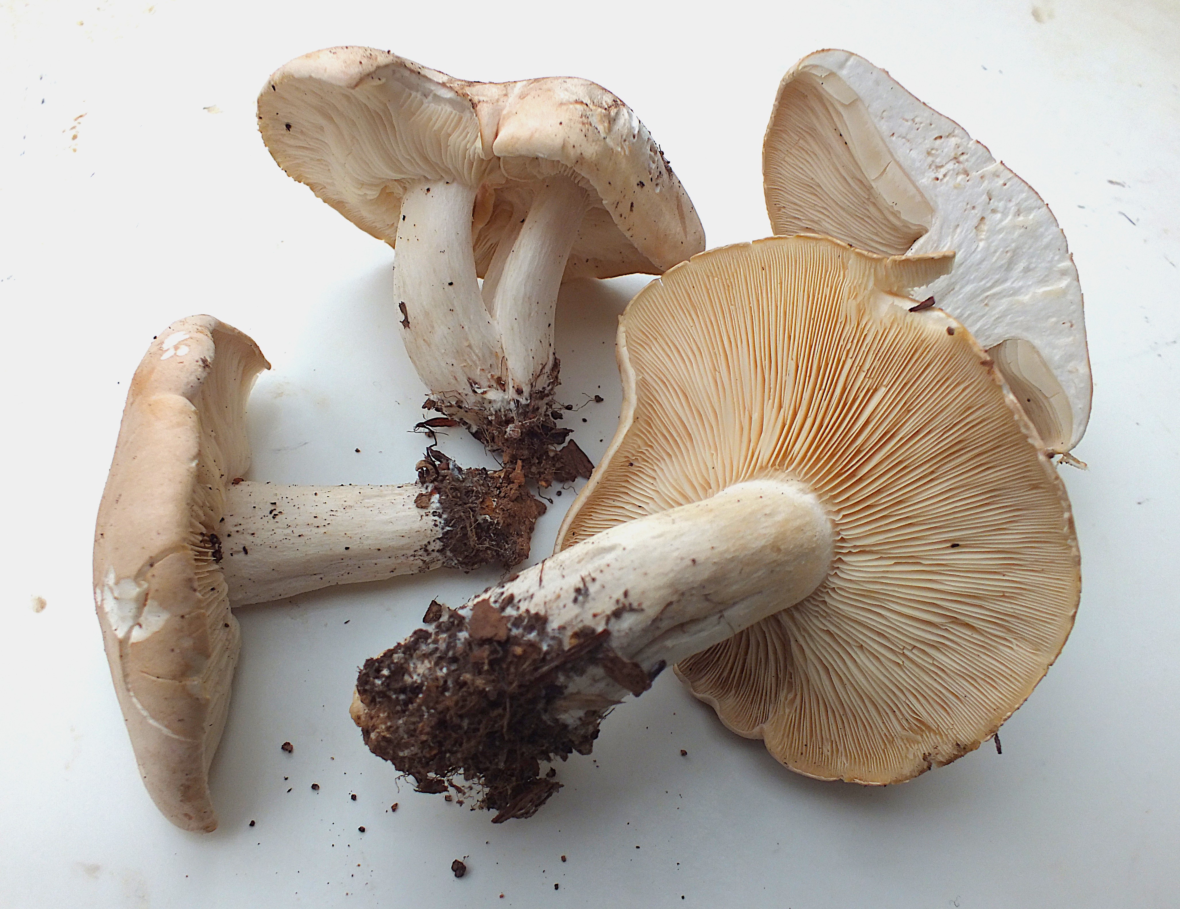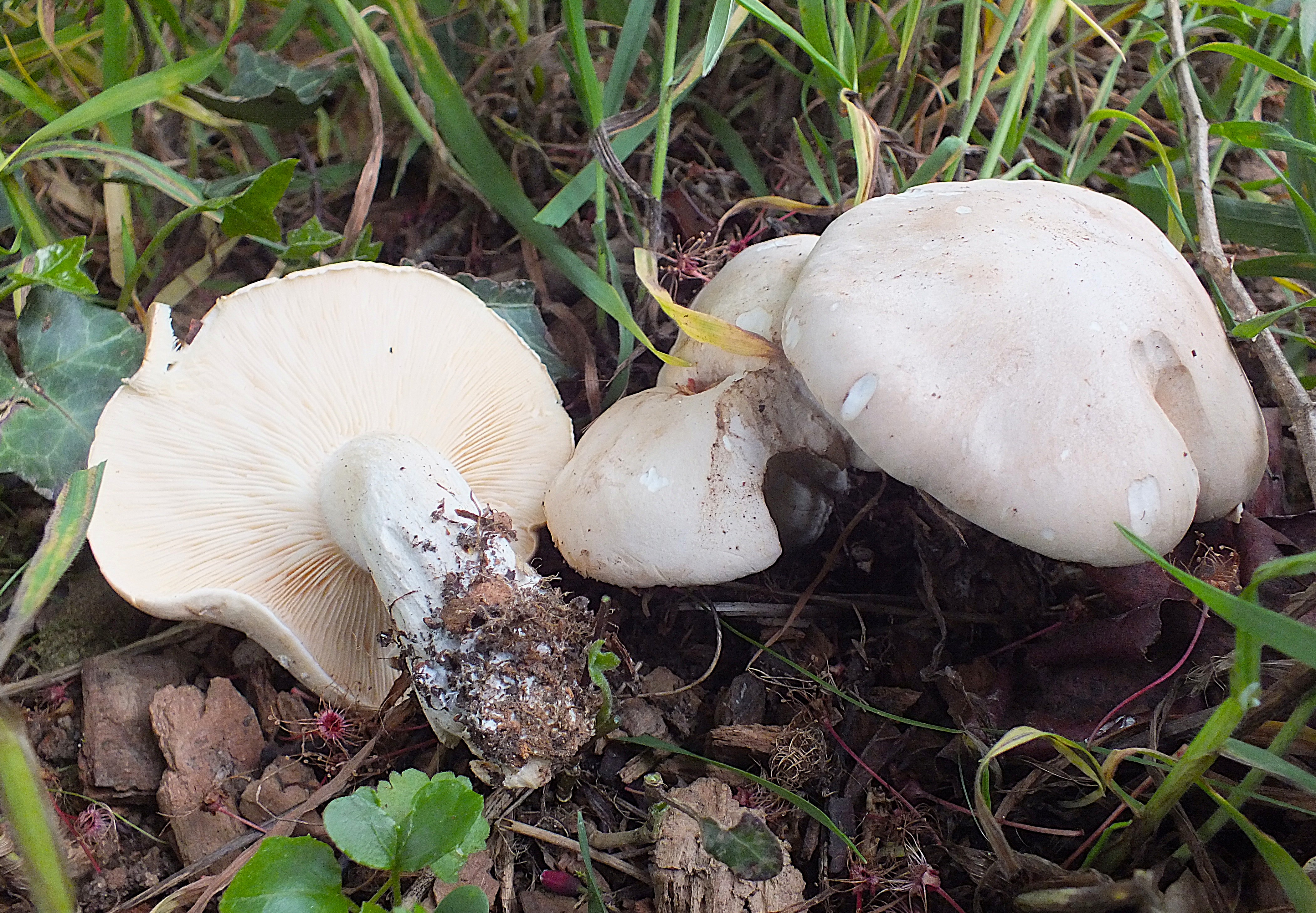 Bonjour à tous, je reviens sur mon sujet Calocybe gambosa du 2 janvier. Je n'ai toujours pas pu trancher par l'étude micro, mais voici que le champignon fait une nouvelle poussée, sur la même station, le 23 mars ! Comme pour la récolte du 30 décembre, les caractères de l'espèce sont bien présents (notamment : sporée blanche, odeur et saveur typiquement farineuses). Pour moi celui-ci est bien un Tricholome de la Saint-Georges (un peu en avance), et c'est donc lui qui aurait fructifié sur la même place fin décembre. Je vous remercie de vos avis. Olivier (Les sujets de cette dernière récolte ont un peu souffert de sècheresse).