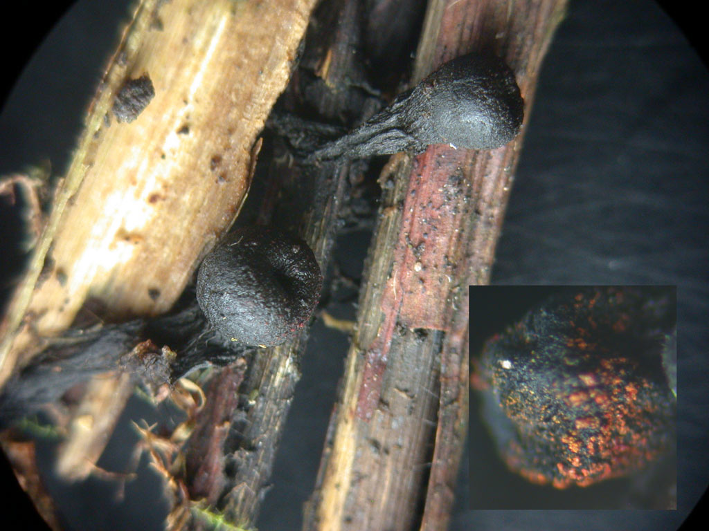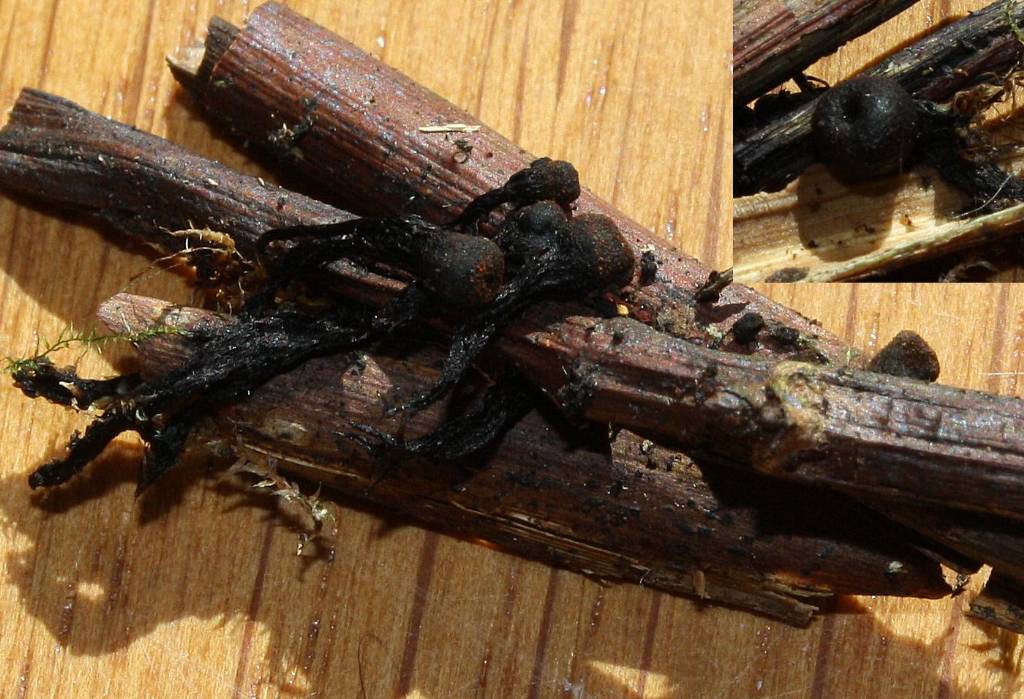 Ce pas si petit champignon mesure 1,5 centimètre pour les plus grands pour un diamètre de sommet ne dépassant pas 3,5mm. Sa consistance est dure et cassante. Ils semblaient fixer entre elles les brindilles, mais peut-être fructifiaient-ils sur un autre support, que je n’aurais pas remonté à la « surface ». Je dois préciser que bien que je sois plutôt souple, j’étais dans une position des plus inconfortables, dans une pente importante, coincé sous un sapin, au milieu des framboisiers et je regrette maintenant de ne m’être pas étiré un peu plus.