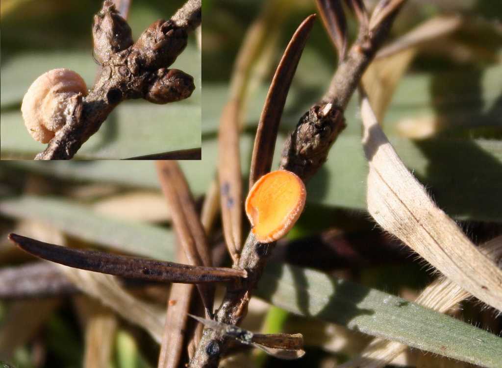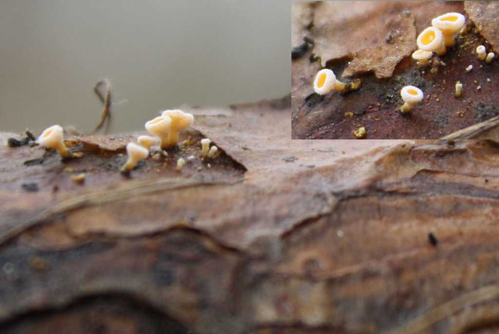 J'en sais plus grâce à Jean-Pierre et Rémy sur les "petits" ascos sur branchette de sapin. Il s'agit de Pithya vulgaris. Ils poussaient sur un tas de branches en hauteur, loin du sol. Sous cet amas, je trouve tous les ans quelques Cantharellus subpruinosus (?) fidèles à leur station. Je connais donc bien le coin, j'y retournerai pour voir si j'y retrouve P vugaris d'ici quelques jours. Merci à mes deux correspondants pour l'aide qu'ils m'apportent. Bonne soirée et bonne nuit. Gérard