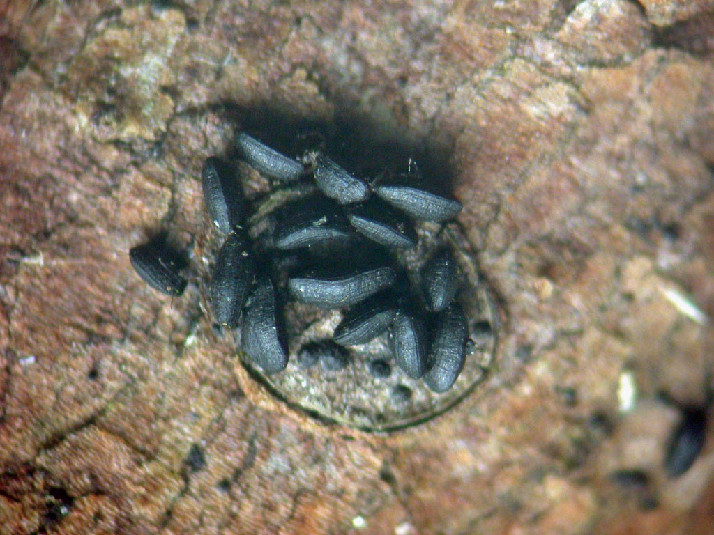 Sur bois mort de feuillu aussi, ces petites têtes de moines vues du ciel se repèrent par la luminosité de leur tonsure entourant l'ostiole. Encore 1 mm seulement avec la masse hirsute des cheveux. Leurs spores sont grandes et remarquables.