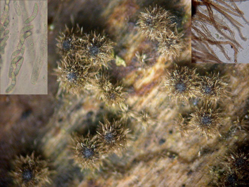 Sur bois mort de feuillu aussi, ces petites têtes de moines vues du ciel se repèrent par la luminosité de leur tonsure entourant l'ostiole. Encore 1 mm seulement avec la masse hirsute des cheveux. Leurs spores sont grandes et remarquables.