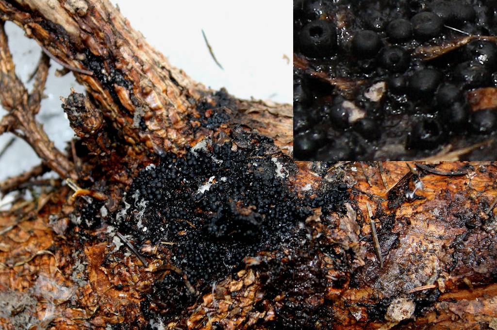 Je les ai récoltés à 1300 mètres d’altitude à la fonte des neiges. Ils fructifiaient sur branche cortiquées de Pin Sylvestre, ce qui ne correspond ni au support des Suisses (Picea et Abies alba), ni au support des fiches d’ASCOfrance (Picea et Cupressus). J’ai donc quelques doutes quant à ma détermination, d’autant que le subiculum est noir alors que le BK le décrit comme brunâtre. Pour le reste des caractères macroscopiques, cela « colle » avec R.thelena. Avez vous d'autres idées ?