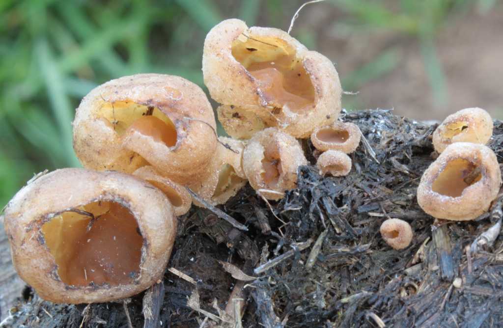 Champignon récolté sur crottin de cheval. Le plus grand atteint tout juste les deux centimètres. Je pense à Peziza vesiculosa, peut-être à var. saccata compte tenu de l'hymenium ridé, mais sans certitude. Avez vous d'autres suggestions ?