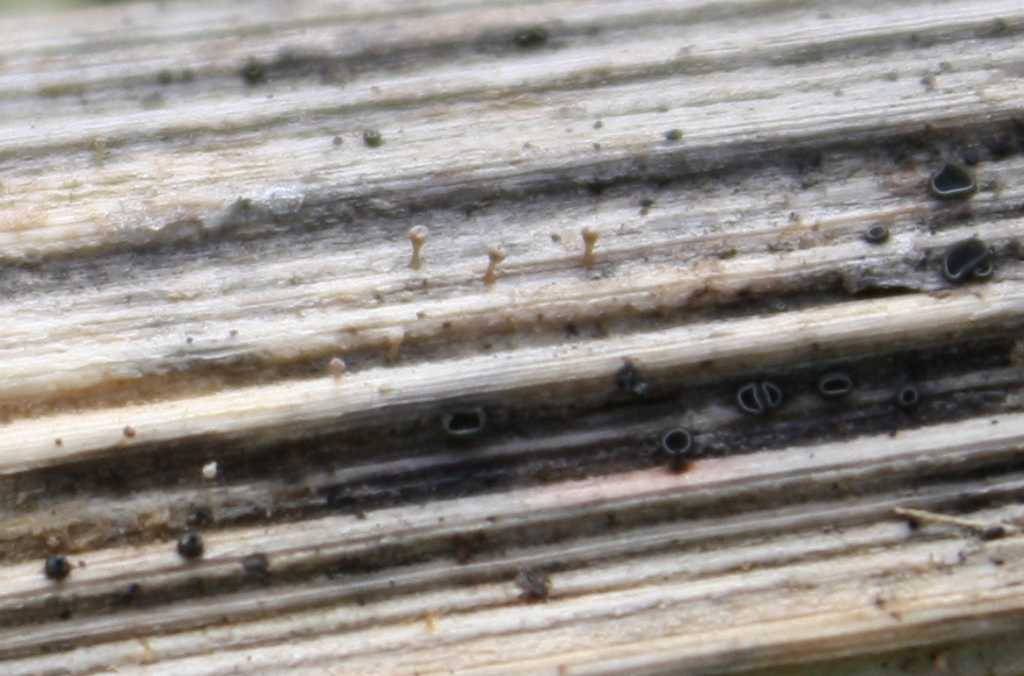 Sur Cirsium(?) , il y a en effet 3 champignons . Le petit avec un pied appartient au genre Crocicreas (ex Cyathicula ) . Le 2ème pourrait être une mollisia ou une pyrenopeziza , le 3ème pourrait être une Leptosphaeria .