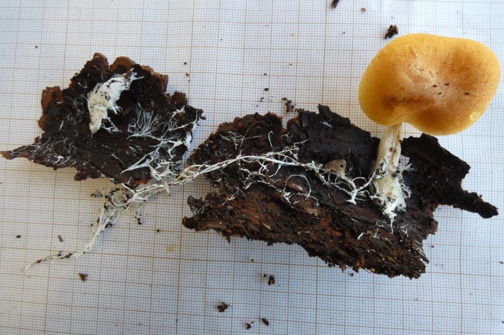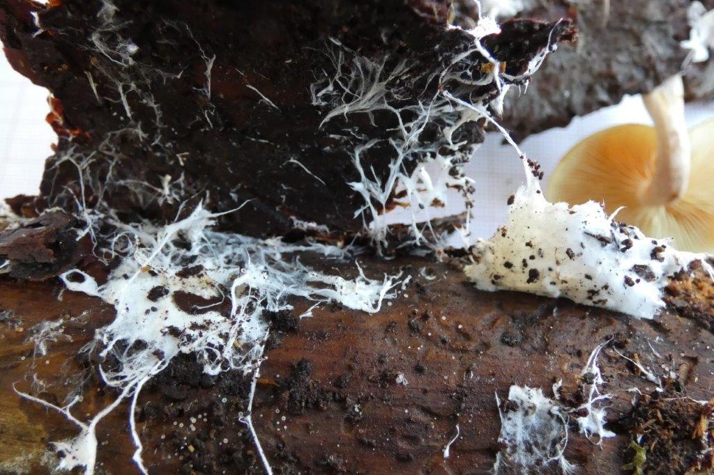 Bonjour Patrick. En effet il y a des "ficelles" qui tiennent au pied et qui sont certainement du mycellium. Mais il y a aussi un autre amas blanc, séparé, qui montre la formation de pores, et qui, comme le suggère Nommo, pourrait bien être Trechispora mollusca ou un avoisinant. Michel.