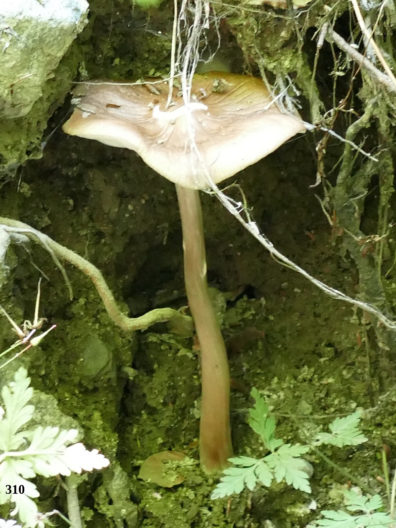 Bonjour, Dans les Hautes Pyrénées, en juillet, j'ai rencontré cet exemplaire, très au perché ( 25 à 30 cm) prés d'une souche de hêtre. Son chapeau est d'environ une dizaine de cm beige, plissé, mamelonné en son centre, glabre, non visqueux, avec des lames adnées, blanches, serrées. Le stipe est rigide, cylindrique profondément radicant. Sa chair est blanche, immuable, à l'odeur, faible mais fruitée, saveur douce. Pouvez-vous m'orienter pour connaitre son genre ? Merci