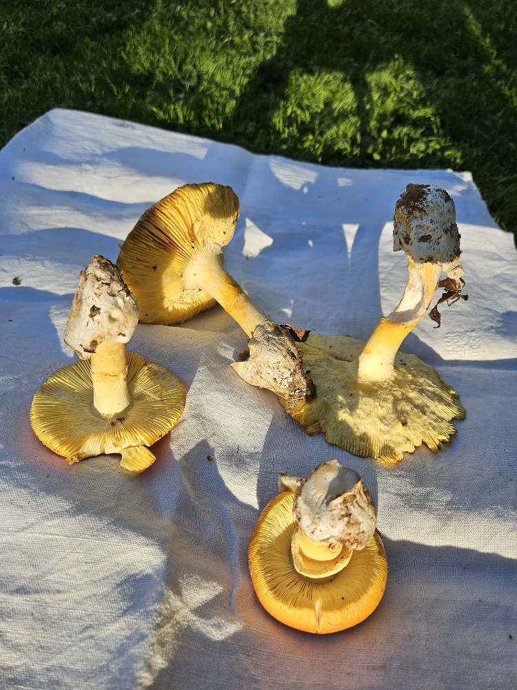 Sauf erreur, 4 amanita caesarea, trouvées à quelques mètres les unes des autres. Si ça ne se voit pas sur les photos, chaque champignon a ses lames jaunes et, toujours sauf erreur de ma part, les seules amanites à lames jaunes sont les oronges.