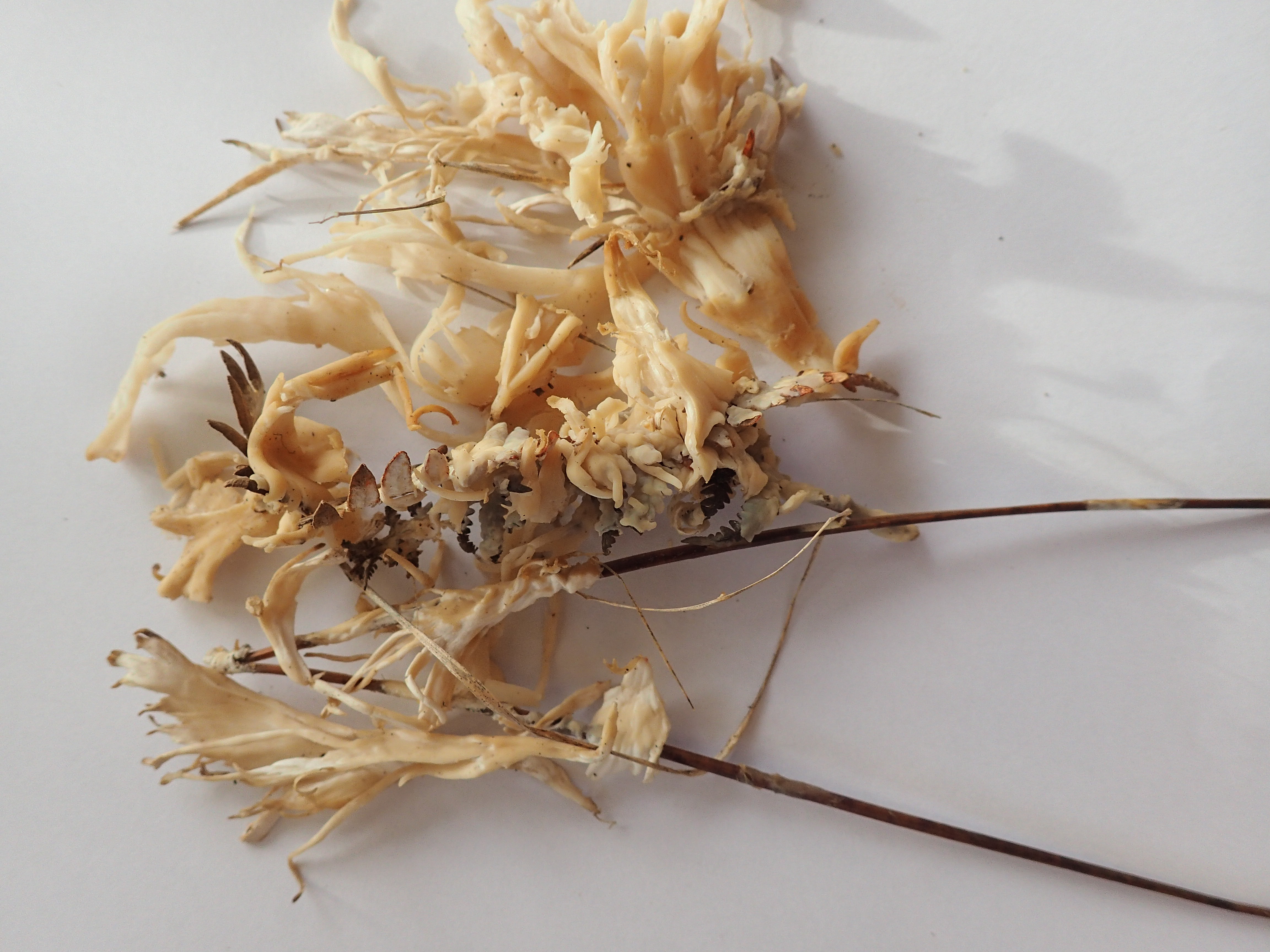 Bonjour Voici un champignon ressemblant à un Sparassis mais avec des lanières beaucoup plus souples et beaucoup plus fines. De plus il incruste le support fait d'aiguilles de pin et de feuilles de fougères comme le font certains myxos (Mais rien à voir). Je ne trouve rien dans les Sparassis (laminosa n'ai pas cette allure et crispa encore moins) ni dans les Clavaria. Les spores sont hyalines, ovoïdes sans guttules de taille 6 - 7 x 5 µm, avec un petit stérigmate comme chez Sparassis crispa. Merci de votre aide Rémi