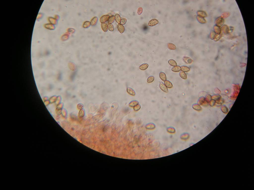 Pour repondre en partie à Matfin voilà ce que l'on peut faire avec un simple numérique. Il suffit de placer l'appareil sur l'occulaire et de mettre au point. il n'y a pas besoin d'adaptateur avec cette méthode qui n'est pas toujours facile je le reconnais mais qui peut donner un résultat tout à fait correct. Pour exemple cette photo des spores de Gymnopilus picreus avec une autre des sujets entier mais qui elle est de médiocre qualité. C'est également une nouveauté pour l'Anjou. Jean-Luc