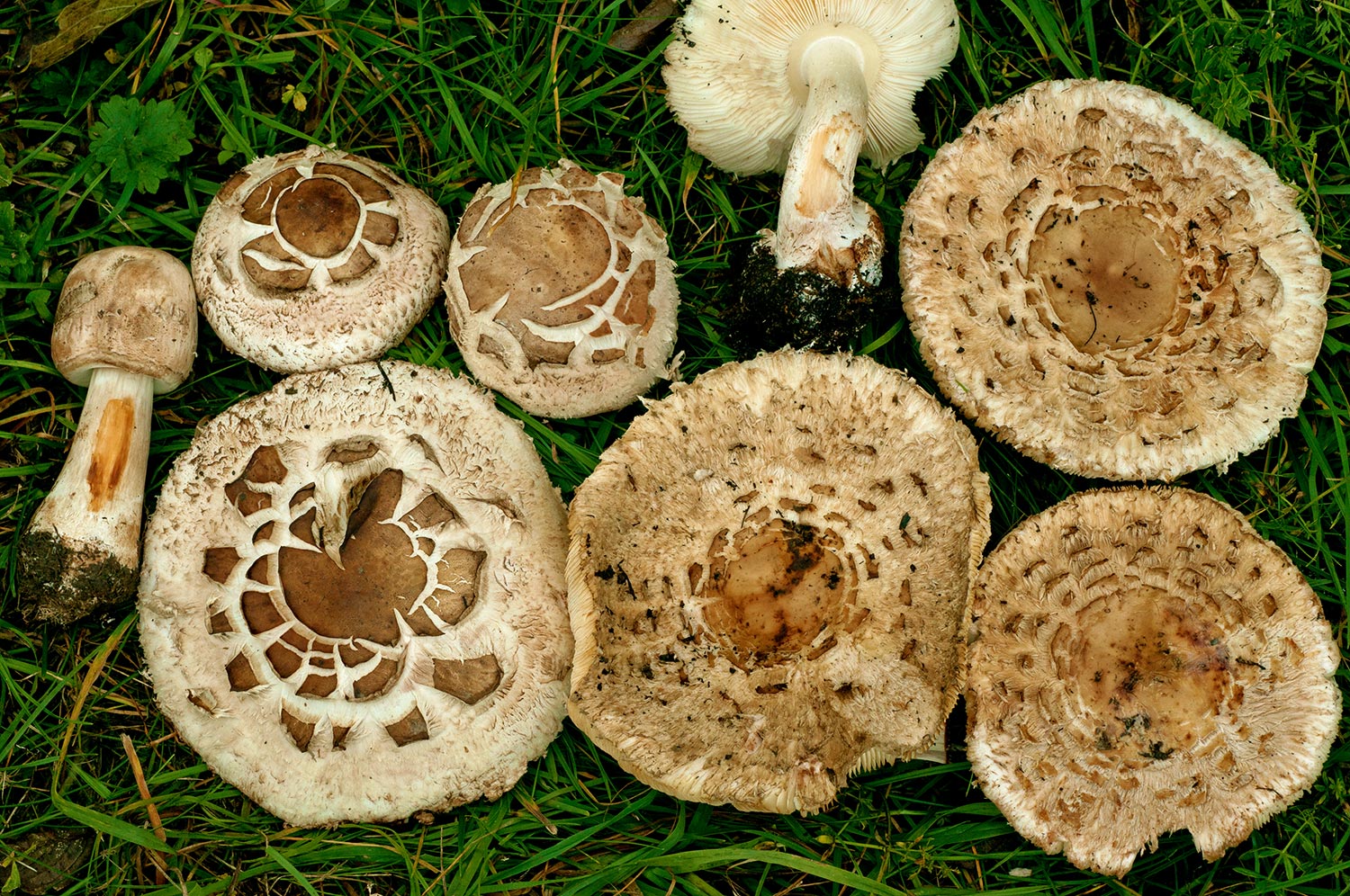 6) Écailles de chapeau fixées de manière lâche ( =très labiles), faciles à enlever, les bords des écailles se détachent souvent ; avec parfois des reflets roses dans les lames ; hyphes de la cuticule partiellement à paroi nettement épaisse (jusqu'à 2 μm d'épaisseur ; mais voir discussion) ; répandue dans toute l'Europe : = M. rhodosperma (P.D. Orton) Migl. = Macrolepiota fuliginosa (Barla) Bon ss. Lange, Vellinga, non ss. orig. = Macrolepiota konradii (Huijsm. ex P.D. Orton) M.M. Moser ss. Breitenbach & Kränzlin, non ss. orig. = (Sternschuppiger Riesenschirmling)