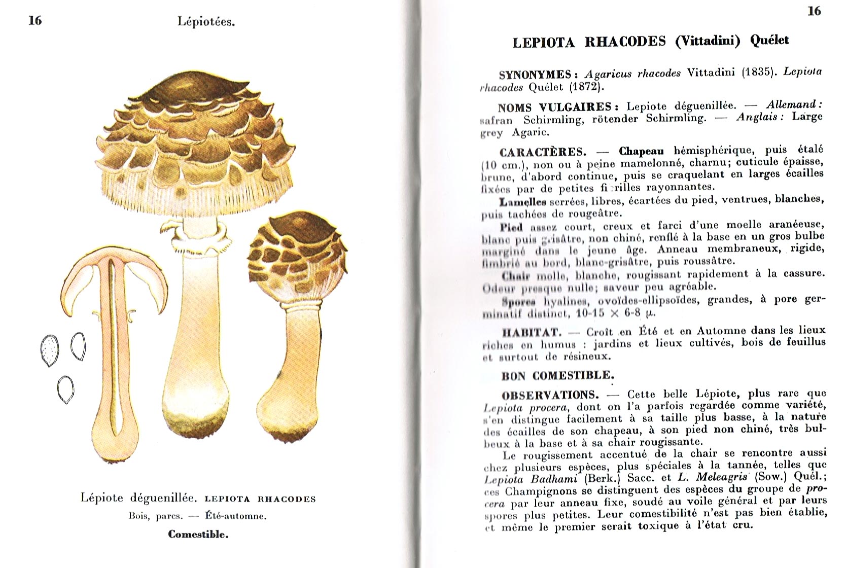 ecmyco a écrit: Concernant, le Chlorophyllum rachodes (Lépiote safranée des jardin à pied en massue), j'ai constaté, après consultation du vieux livre si cher aux pharmaciens d'après la 2ème guerre mondiale "Champignons comestibles et vénéneux" d'André Maublanc, de milieu de 20ème siècle, que cela concordait avec sa planche de Lepiota rhacodes (Vittadini) Quélet par ses écailles du chapeau contrastée par rapport au fond et par le pied en massue. Fouad, je t'ai fait une copie de la dite planche du Maublanc que je joins au présent. Sinon, lis bien le document de Gernot FRIEBES, lis-le, relis-le, il est riche, y compris dans les "discussions" où il montre que les anciennes gravures de Chlorophyllum qui sont censées correspondre aux "types" de référence... Ne montrent même pas tous les caractères, ou montrent des caractères contradictoires, par rapport aux définitions actuelles...