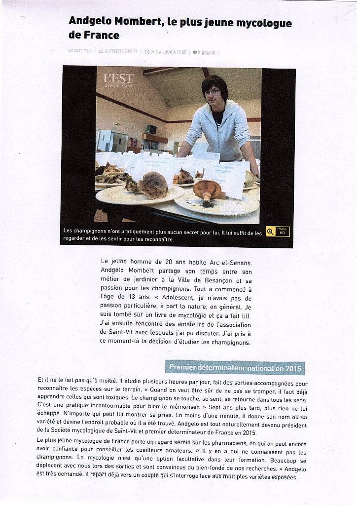 Bonjour, Voici un article publié sur l'Est Républicain. Nous avons l'honneur sur mycodb d'avoir des photos de l'ami Andgelo. Bravo à notre jeune mycologue ! Rémi