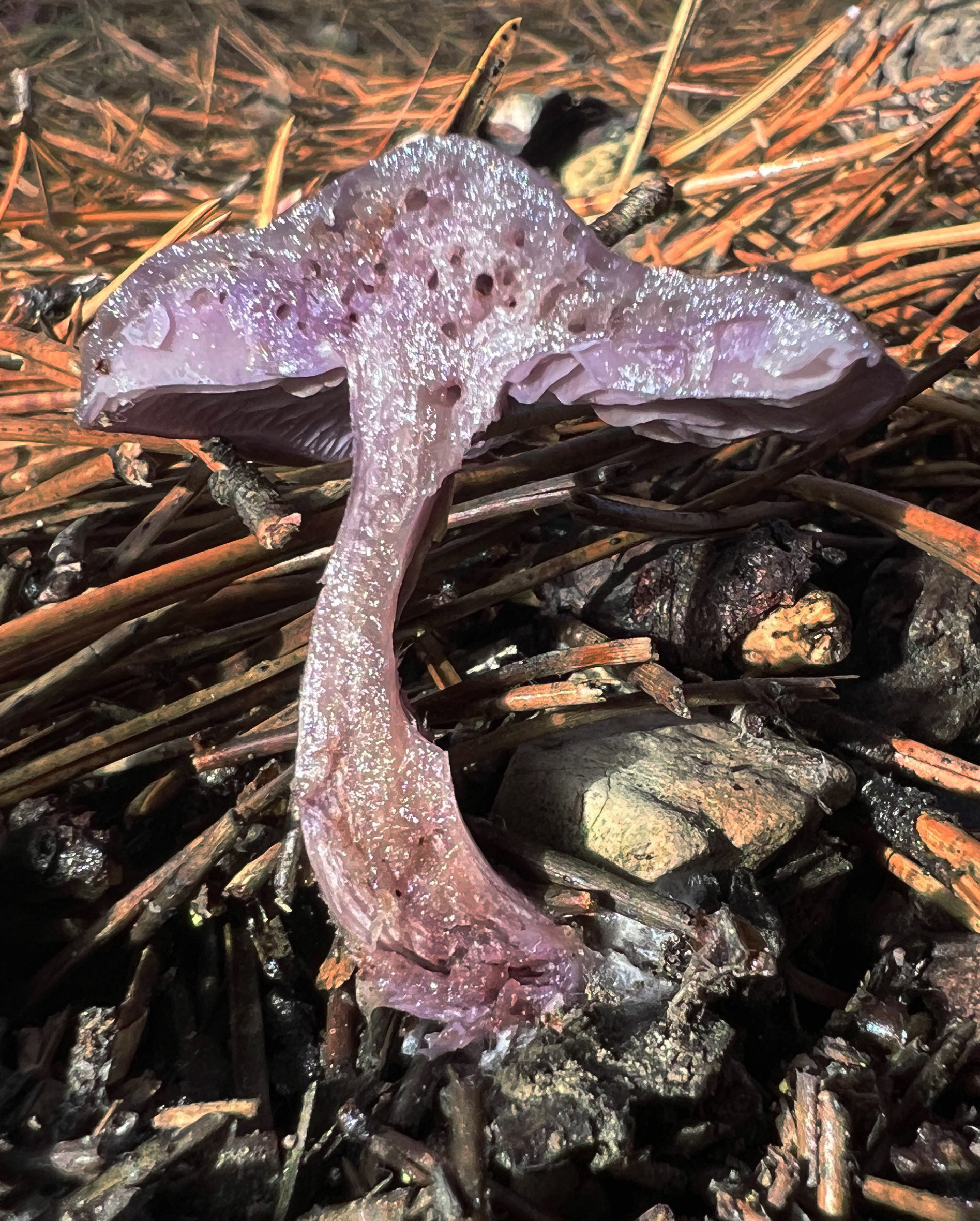 Bonjour, un Lepista nuda Pied bleu je suppose, bien qu'il soit plus améthyste que bleu… Le pied est partiellement mangé, d'où son resserrement au milieu. Merci pour votre avis.