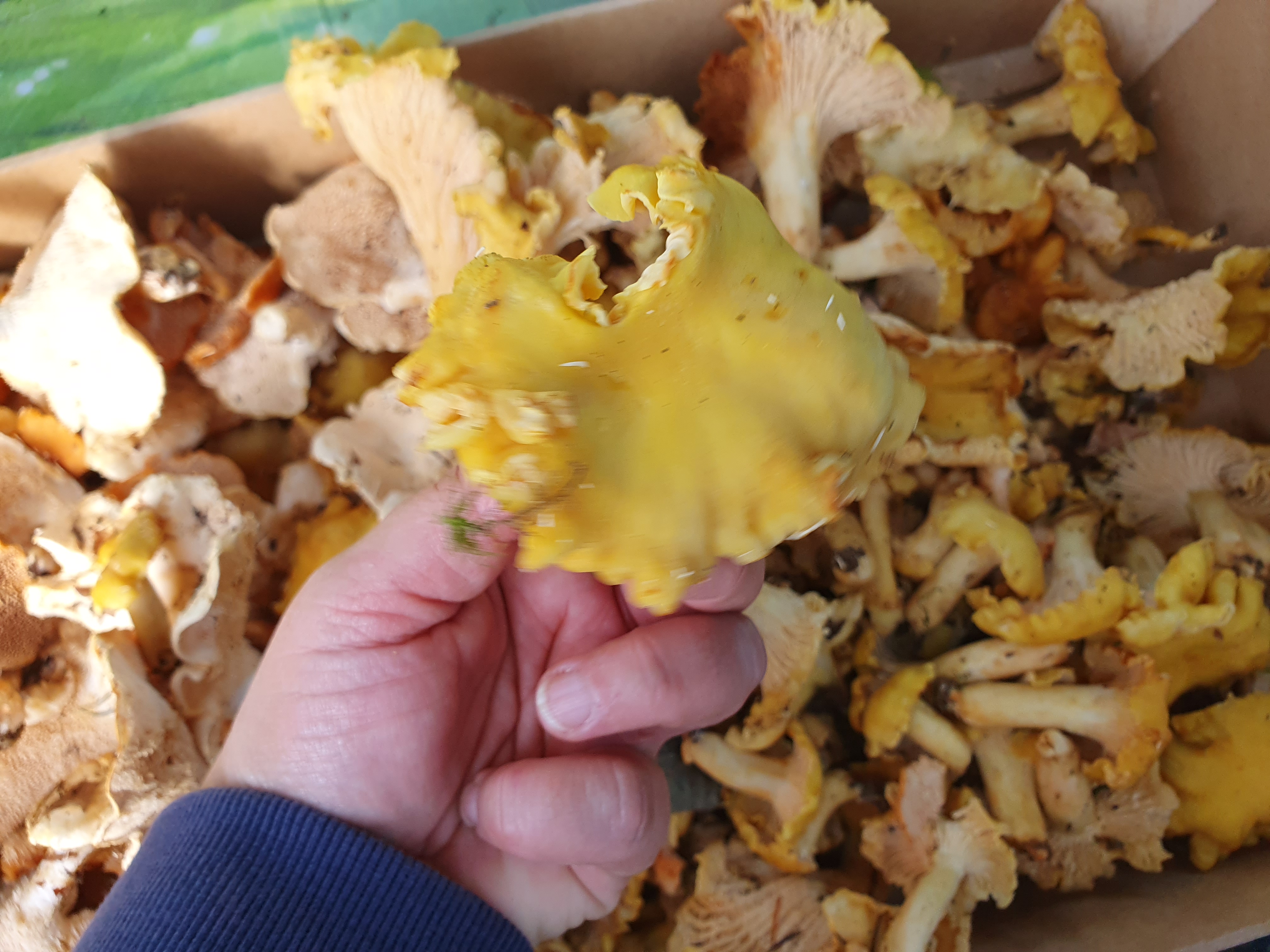 Je pense à Cantharellus cibarius (Girolle) et Hydnum repandum (Pied de mouton).