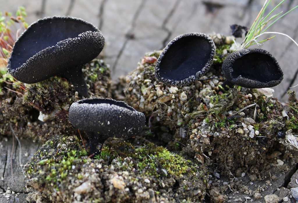 J'ai encore besoin de votre aide, pour ce champignon récolté à 1250 mètres d'altitude. Ils fructifiaient le long des marches d'escalier d'un hôtel restaurant, il en sortait même dans l'allée recouverte de gros graviers. Le sol est sableux et ils ne sont pas liés à du bois. Le plus grand des spécimens présente un diamètre de 3,5cm pour une hauteur de 3cm. L'hymenium est lisse, et la face externe granuleuse. Même jeunes ils présentent une forme de calice. La consistance est élastique. Est ce que quelqu'un a une idée ?