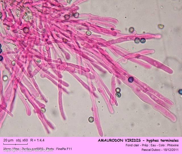 Arrondies ou ovoïdes finement aculeolées, souvent guttulées, subhyalines ou teintées de bleu vert, 4-6 x 3-5 µm, bleu noirâtre ardoisé, en masse. Hyphes 2,5-6 µm, subhyalines, teintées de vert à parois minces, bouclées. Basides 15-24-(32) x 4,5-7 µm, à 2-4 stérigmates longs de 3-4,5 µm.