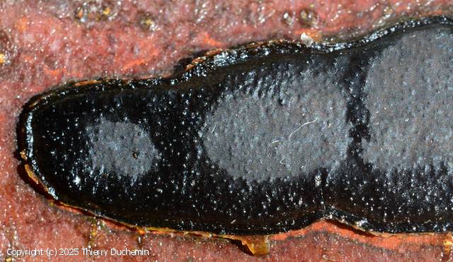 Périthèces de 0.4 à 0.6 mm de diamètre, à peu près au même niveau que le stroma.