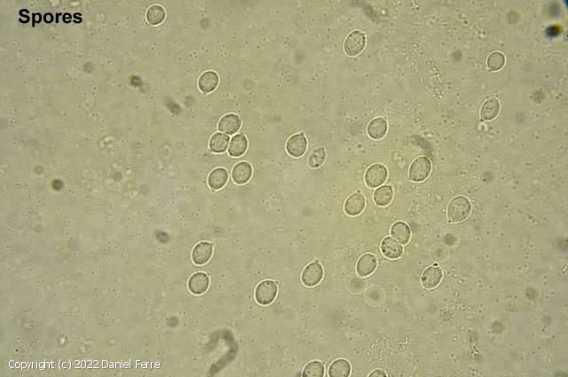 Subsphériques ou guttiformes, lisses, hyaline, uniguttulées, 2-3,5-4,5 x 2,2-2,5-(3,5)µm. I-. Basides étroitement clavées, 9-15-28 x 3,5-4,5-6 µm, tétrasporiques, stérigmates longs de 3-6 µm. Septocystides cylindriques, obtuses, le plus souvent septées et bouclées, 50-65 x 4,5-6 µm, plutôt rares voire absentes. Monomitique : Hyphes larges 1,5-3-4,5 µm, régulières, à parois minces, cloisonnées, bouclées.