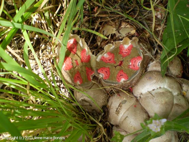 Aseroe rubra est stipité, a des branches dichotomiques alignées sur le plan horizontal, peu courbés, un trou à son centre.