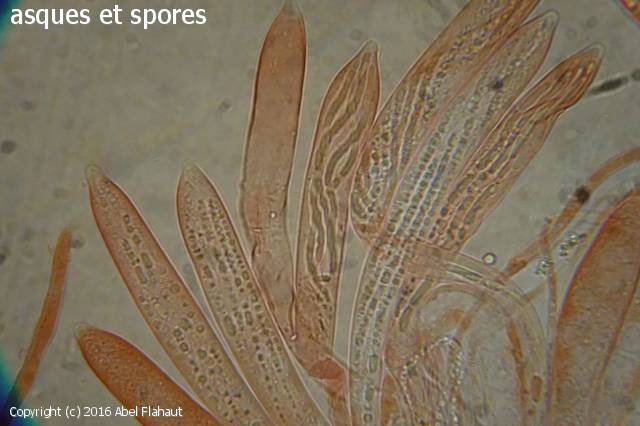 Filiformes, lisses, hyalines, guttulées, 75-90 x 2-2,5µm. Asques octosporés, 175-190 x 9-10 µm. Paraphyses cylindriques, la partie basale moniliforme.