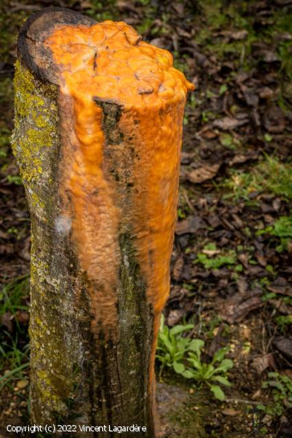 Le champignon produit une gaine visqueuse blanche puis rose à orangée sur le substrat dans laquelle les périthèces peuvent être entièrement ou partiellement immergés.