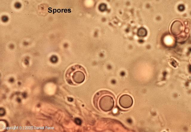 Obovales-subglobuleuses, brièvement atténueés ou apiculées à la base, lisses, hyalines, ordinairement 1 guttulées, 4,3-6 x 3-4-5 µm. I-. Basides clavées, 15-20(-24) x 4-6-7 µm, tétrasporiques, occasionnellement bouclées à la base. Pas de cystide. Paraphyses rameuses très fines. Monomitiques : Hyphes parallèles subcohérentes, 0,5-2,5 µm, généralement bouclées. Poils marginaux hyalins, lisses, et finement ramifiés.
