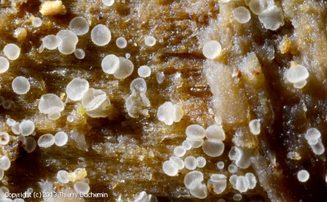 Avec Hyaloscypha leuconica croissant sur bois de conifères et de pommes de pin tombées, tels que Pinus et Larix, mais également d'autres formes de champignons distinguables peuvent se produire sur les rameaux morts et cupules de Fagus et autres.