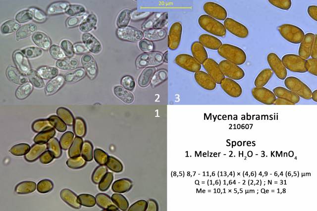 Spores cylindriques plus ou moins elliptiques, lisses, hyalines, guttulées, 7,5-11 x 5-6 µm, amyloïdes.