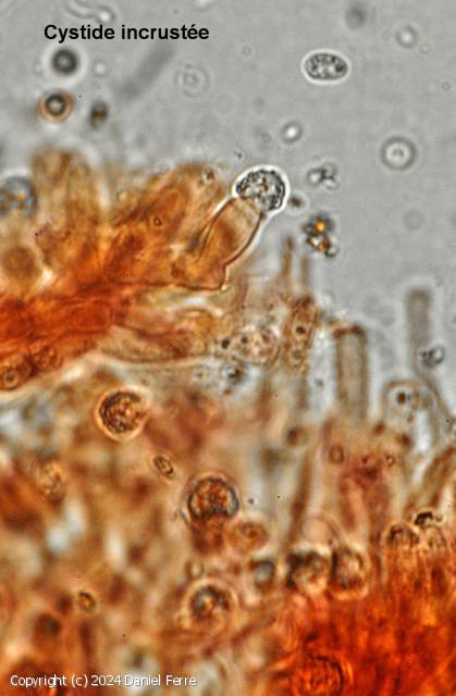 Cystides de 2 types: dans la trame et le sous-hyménium, présence de cystides cylindriques à fusiformes recouvertes au sommet d'une masse cristalline globuleuse, 15-20 x 5-8 µm. Au niveau hyménial: rares cystides (difficiles à trouver) cylindriques à sommet arrondi ou subfusiformes, 25-40 x 5-8 µm.
