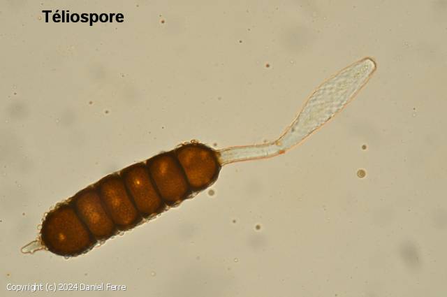 Téliospores cylindriques cloisonnées à 3-6 septes généralement 5, mesurant 60-75 x 25-30 µm. Paroi verruqueuse, brun sombre. Pourvues d'un pédicelle hyalin long de 75-160 µm.