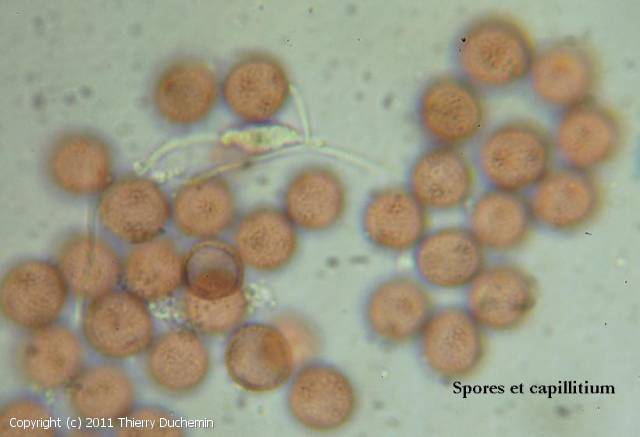 Spores verruqueuses avec groupe de verrues plus foncées mesurant de 6 à 9μm de diamètre.