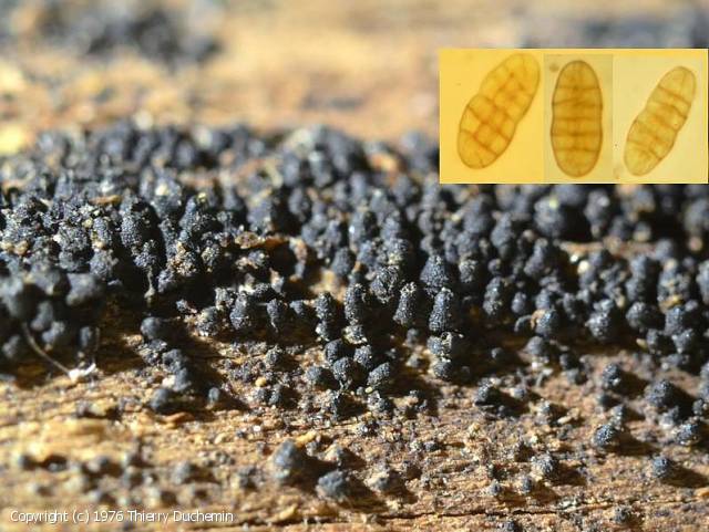 Spores mûriformes brunâtres 15-25x8-12µm.