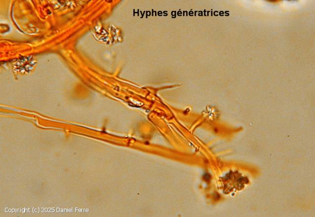 Irrégulièrement elliptiques, aplaties unilatéralement et parfois légèrement arquées, hyalines,6-7,5 x 2,5-3,5 µm. Basides clavées 12-23 x 5-9 µm, tétrasporiques et bouclées. Cystides de deux sortes : (1)- lisses avec grosse vésicule à l'extrémité (halocystides). (2)-lisses, pointues et couvertes d'une mâcle cristalline (astrocystides). Hyphes larges, septées et bouclées.