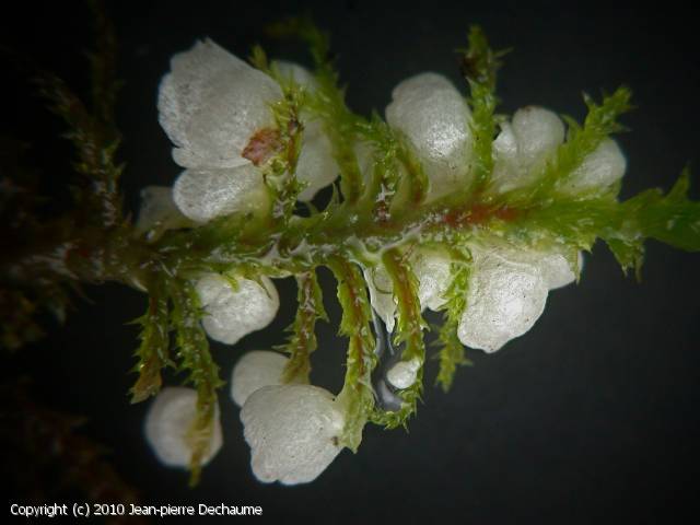 Fructification formée d'une cupule pendante en forme de coupe ou d'entonnoir d'environ 3 à 4 mm, blanche. Le point d'attache au support est plus ou moins central. Hyménium non plissé.