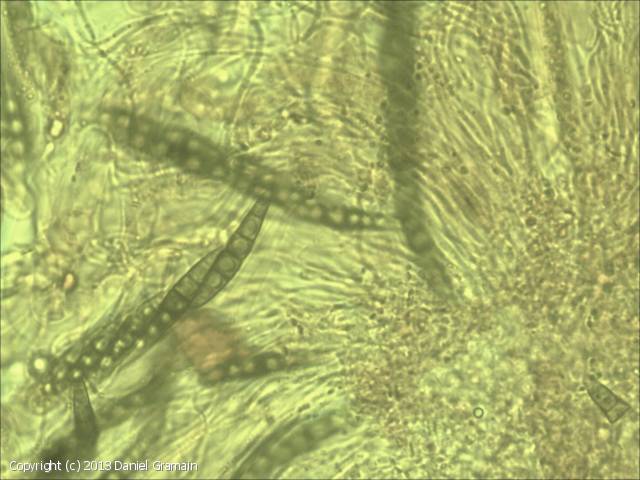 Ascospores brun-doré,pâle aux extrémités, séparées en 5 cloisons 35-40 X 7-8 µm.