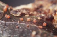 Calonectria daldiniana De Notaris (1867), Commentario della Societa crittogamologica Italiana, 2(3), p. 477 Calonectria pyrochroa (Desmazieres) Saccardo (1878), Michelia, 1(3), p. 308 (nom actuel) Dialonectria pyrochroa (Desmazieres) Cooke (1884), Grevillea, 12(64), p. 111 Ophionectria puiggarii Spegazzini (1889), Boletin de la Academia nacional de ciencias en Cordoba, 11(4), p. 532 Nectria abnormis Hennings (1897), Hedwigia, 36(4), p. 219 Nectria leguminum Rehm (1900), Hedwigia, 39(4), p. 221 Candelospora ilicicola Hawley (1912), Proceedings of the royal Irish Academy, section B: biological, geological, and chemical science, 31(13), p. 11 Tetracytum lauri Vanderwalle (1945), Parasitica, 1, p. 149 Cylindrocladium ilicicola (Hawley) Boedijn & Reitsma (1950), Reinwardtia, 1, p. 57 Calonectria hederae G. Arnaud ex C. Booth & Murray (1960), Transactions of the British mycological Society, 43(1), p. 70 Cylindrocladium hederae G. Arnaud ex Peerally (1991), Mycotaxon, 40, p. 335 References : Ellis p. 143 pl. 622. Groupe : Pyrenomycetes Classification : Ascomycota / Sordariomycetes / Hypocreales / Nectriaceae Chapeau/Fructification : Peritheces, environ 0,3 mm de diametre, orange a rouge, assis sur un petit stroma. Habitat : Sur feuilles mortes d'Hedera helix. Cylindrocladium accompagne C.hederae souvent sur les taches brunes des feuilles. Spores : Ascospores hyalines, 3 cloisons, 50-60 x 6-8µm. Comestibilite : Sans interet Commentaires : Peu frequent. Octobre-Novembre. |