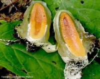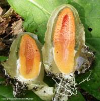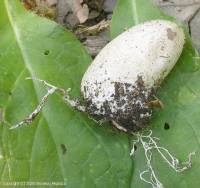 Remarque : Oeuf oblong, parfois très allongé, un peu cylindrique, 3-4 cm de haut, 1,5-2 cm de diamètre, uni, relié à plusieurs cordonnets mycéliens de couleur blanche, déhiscent par le sommet. Péridium blanc, composé de trois couches, l'interne et l'externe membraneuses et blanches, l'intermédiaire gélatineuse, ambrée.