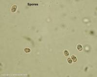 Spores elliptiques, lisses, hyalines à paroi légèrement épaissie, guttulées, (4,1)-5,0-5,8 x 3-3,6 µm
