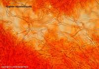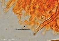 Système trimitique: Hyphes génératrices plus ou moins abondantes, courtement ramifiées et sinueuses, bouclées, à paroi mince, de 2,5-3,5 µm de large. Hyphes squelettiques abondantes, de 3-4 µm de large, tortueuses, à paroi épaisse et lumen net. Hyphes ligatives rares.