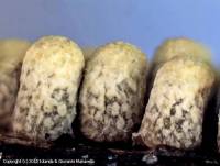 Spores foncées, spinuleuses ou verruqueuses, mesurant de (10-)11 à 13(-14)μm de diamètre.
