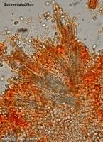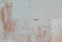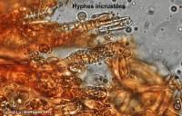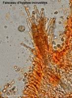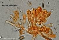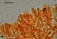 Largement elliptiques, lisses, hyalines, souvent uniguttulées 7-10-11 x 4-5-6 µm. I+. Basides étroitement clavées, 40-50 x 6-7 µm, pourvue d'une partie basale étirée en pédicelle, non bouclées, tétrasporiques. Pas de cystide. Monomitique : Hyphes larges de 2-3 µm, non bouclées ; les hyphes terminales du sommet des dents sont finement incrustées, connées et agglutinées.