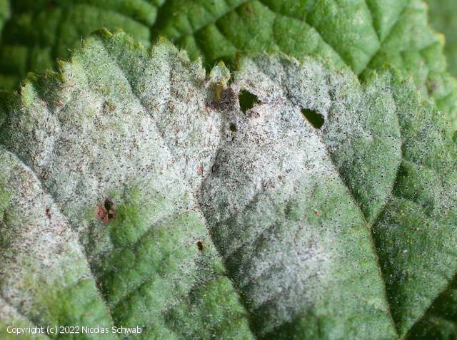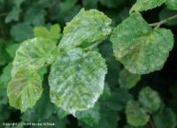 Mycélium amphigène, formant d'abord des petites taches blanches (0,5 à 3 cm) sur les faces supérieure et inférieure des feuilles. Ces taches s’étendent, fusionnent et finissent par couvrir tout le limbe foliaire. Sur la face inférieure, les dépôts provoquent des décolorations jaunes visibles sur la face supérieure. En cas de forte infestation, les feuilles s’enroulent, brunissent et tombent prématurément. Les infrutescences et les jeunes noisettes peuvent aussi être touchées, ce qui entraîne leur décoloration et leur chute avant maturité.