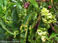 Développement sur la surface inférieure de la feuille,en produisant ça et là des boursouflures ( cloques ) plus ou moins farineuses,et de teintes variant de jaune à rosâtre-rougeâtre.