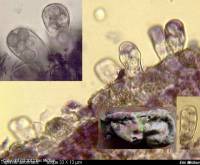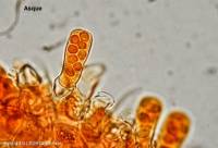 Thèques subcylindriques, octospores, arrondies au sommet, 35-40 x 10-12 µm ; cellule basilaire, 7-8 µm de hauteur et de largeur. Spores rondes ou elliptiques à contour irrégulier anguleux, incolores, lisses, présentant à l'intérieur de fines granulations ( spores secondaires ), 5 à 7 µm de diamètre ou 6-7 x 5 µm, et quelquefois davantage.